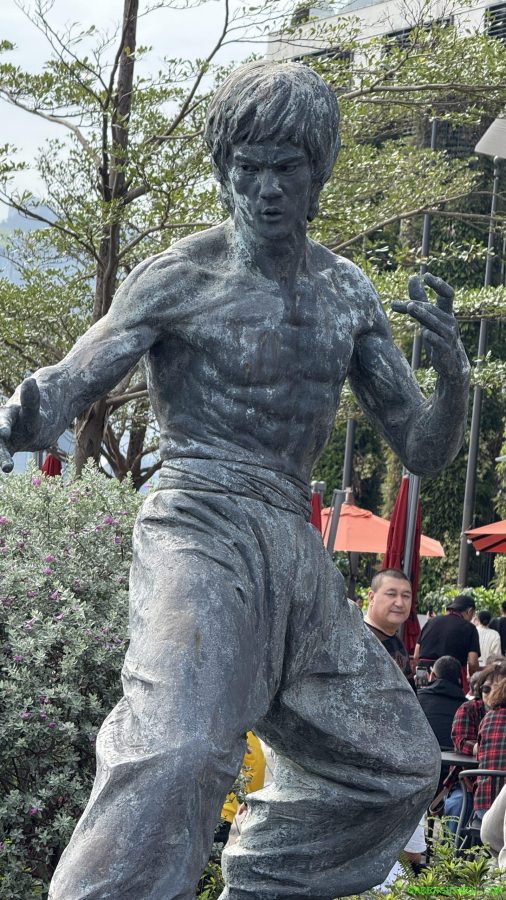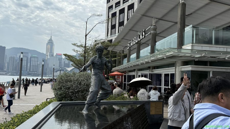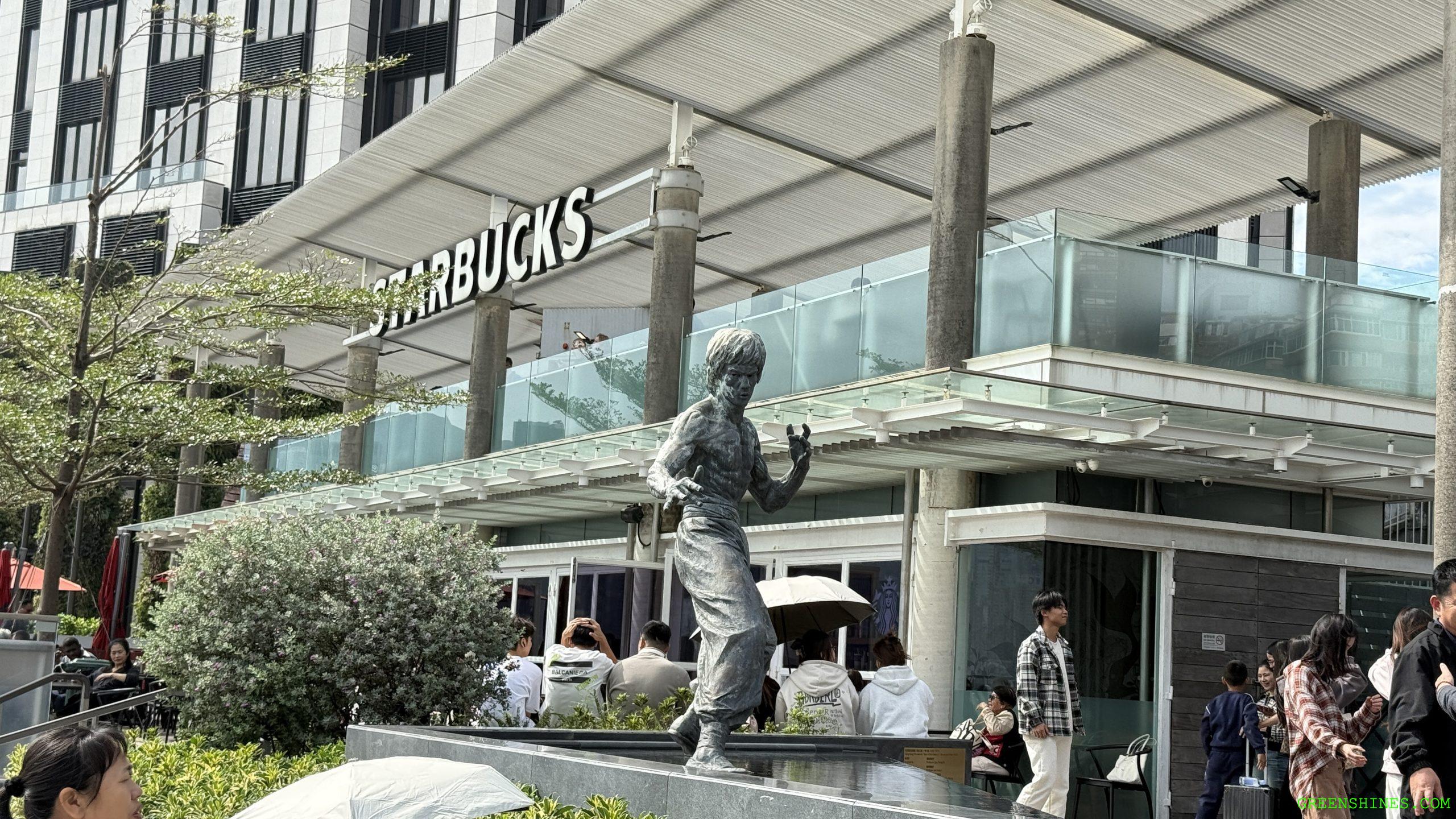 El otro día estaba paseando por aquí, creo que solo he venido dos veces, y le hice estas fotos a Bruce Lee. Normalmente, a este Bruce Lee que está en Hong Kong, en la Avenida de las Estrellas o en Tsim Sha Tsui (creo que se llama), solo suelen hacerle fotos de muy cerca. La razón no es otra que le han puesto un Starbucks gigante detrás, con un letrero enorme que dice STARBUCKS, y no hay forma de hacerle una foto de cuerpo entero sin que salga el letrerazo detrás, hasta el punto de que ahora parece más bien una especie de atracción del propio Starbucks. Yo lo llamo el Bruce Lee del Starbucks.